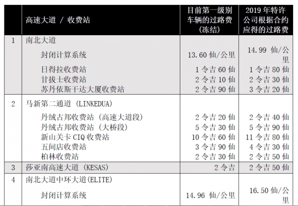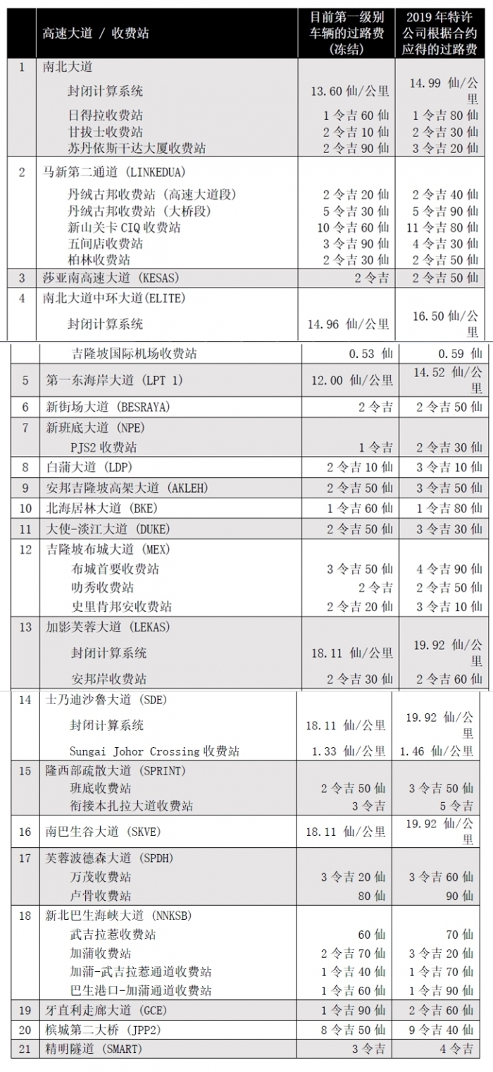 (吉隆坡27日讯)政府將於2019年冻结调涨全国21条高速大道的过路费与摩哆过路费。財政部长林冠英指出,政府將拨出9亿9443万令吉的开销实施上述措施惠及大马人民。他今日发文告指出,內阁於12月12日通过,决定冻结全国21条高速大道所有级別车辆的过路费,这21条高速大道原本在2019年期间可以调涨过路费。「这项决定对於11月2日所宣佈的2019年財政预算案中,只冻结调涨所有城市高速公路过路费的政策,是一项大跃进。」