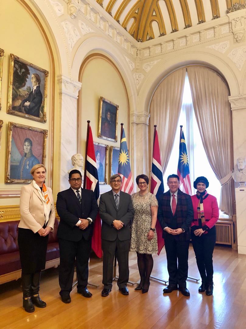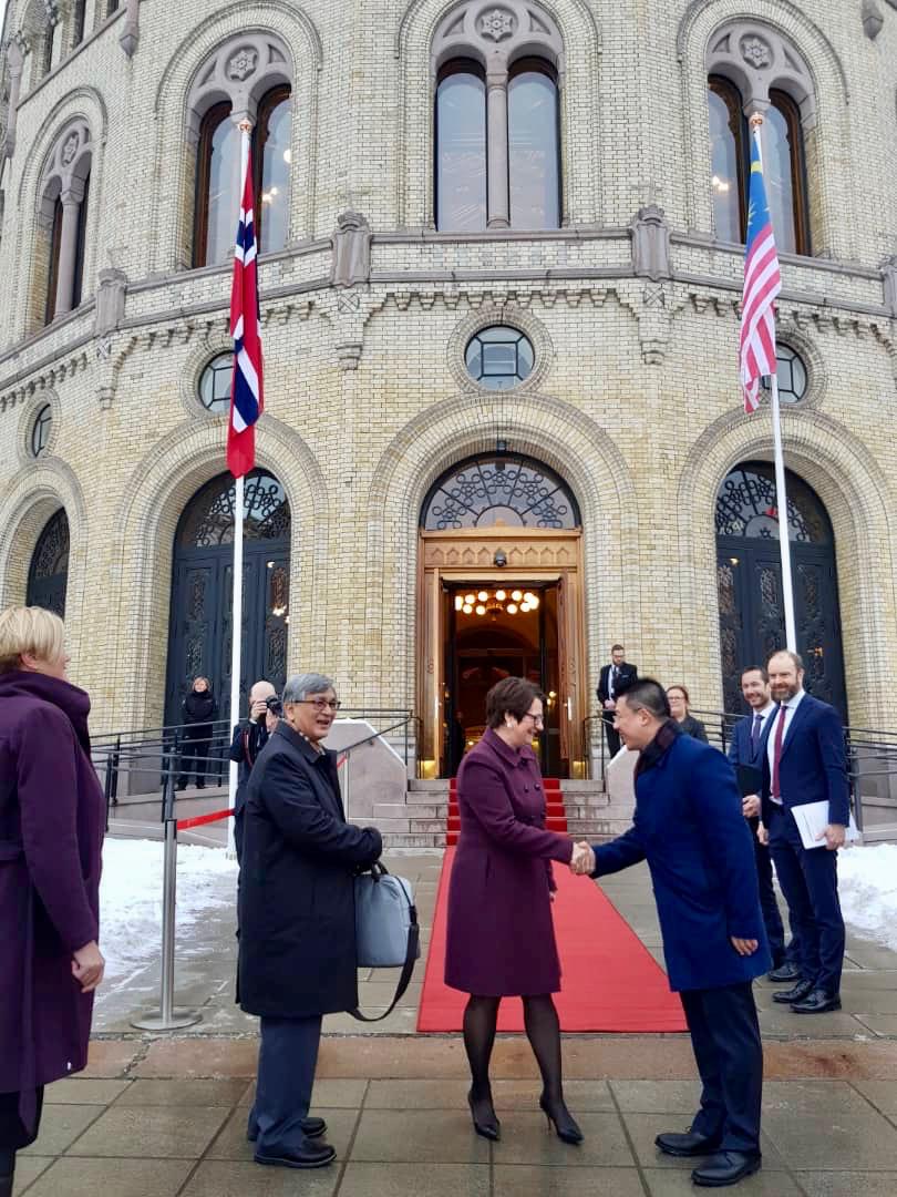 (奧斯陆 24日讯)北欧挪威政府对我国政府在去年改朝换代后落实一系列改革的措施与决心深表激赏并希望与我国进一步扩大合作与发展。国会下议院正副议长拿督莫哈末阿里夫及倪可敏今日在接到挪威政府邀请后在该国进行三天行程紧凑的工作访问,我国代表团在抵达挪威国会时受到该国国会议长威亷逊女士以铺红地毯的方式亲自隆重欢迎,大马国旗也在挪威高高升起,在场陪同的包括挪威驻马大使罗瑟、挪威国会秘书长及下议院秘书拿督罗斯米等。