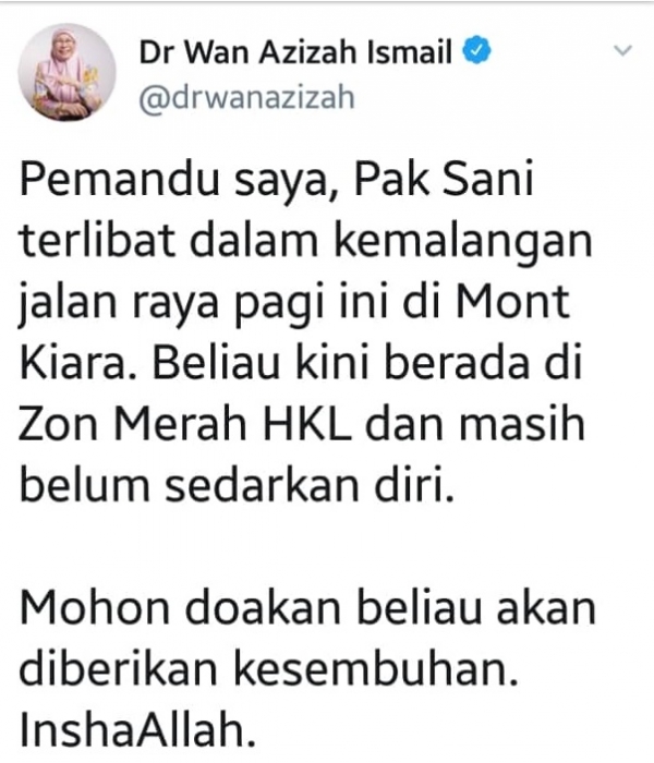 副首相拿督斯里旺阿兹莎司机,今早骑乘摩哆外出时遭人撞后逃!吉隆坡交通调查与执法组副主任沙利弗丁警监指出,这宗车祸是於今早8时许,在隆市满家乐(Mont Kiara)通往泗岩沫的方向发生。初步调查显示,伤者阿都拉沙尼,既旺阿兹莎司机在抵达十字路口时,和一辆行驶在反方向摩哆发生碰撞,跌倒在地蒙受重伤。