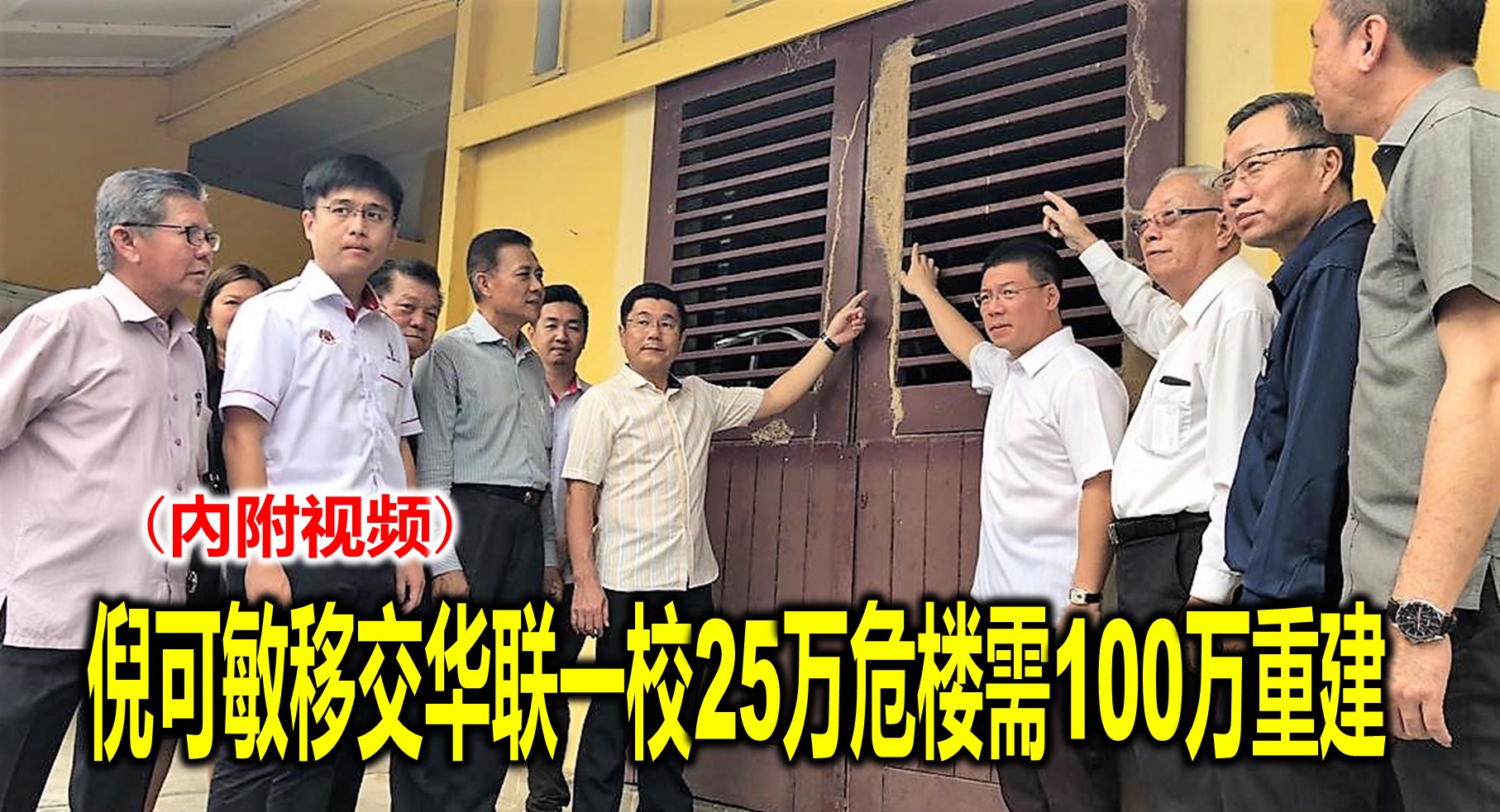 太平华联一校旧校舍沦为白蚁危楼,校方急需100万令吉重建,国会下议院副议长倪可敏今日移交教育部拨款25万令吉给校方后,也关心危楼问题应允助筹100万令吉重建基金。倪可敏也是后廊州议员,他今日联合太平国会议员郑国霖及服务队,在华联一校董事长蔡长深与校长周振彬带领下,巡视该栋一列13间旧课室的白蚁危楼的情况。