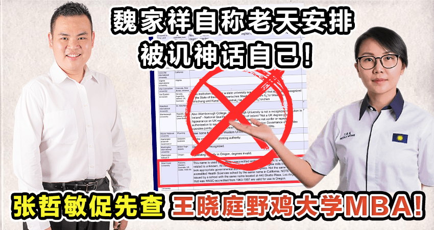 促请曾被委学术鉴定机构首任董事的魏家祥清楚向人民解释马青总团长王晓庭所考获的巴拿马西海岸大学(University of West Coast Panama)的MBA是否野鸡大学或得到马来西亚学术资格鉴定机构(MQA)的认证!他说巴拿马西海岸大学没有被巴拿马本身的全国大学评估与认证委员会(National Council of University Assessment and Accreditation) (CONEAUPA)承认。此外在美国俄勒冈州也被列入发出“非法学位”的“非法大学”。